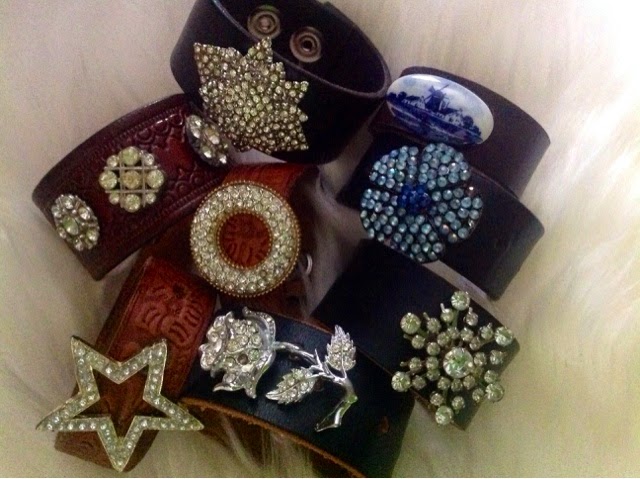 For me, winter is all about having the time and inspiration to plan and dream of ways to add new interest to my shop in anticipation of a spring reopening. This year I am pairing upcycled leather belts with vintage brooches, turning them into an assortment of bejeweled leather cuffs with snap closures.
